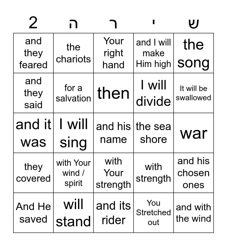 This bingo card has 50 words: Free!, And He saved, on that day, and he saw, the sea shore, the Great Hand, and they feared, His servant, then, he will sing, the song, and they said, I will sing, and its rider, in the sea, my strength, and it was, for a salvation, my father, and I will make Him high, war, His name, the chariots, and his name, He threw in the sea, and his chosen ones, they covered, they went down, Your right hand, with strength, and with a lot, those who stand up to You, You will throw, Your anger, it will be consumed, and with the wind, Your anger / nose, will stand, I will chase after, I will divide, It will be filled, my sword, with Your wind / spirit, Mighty ones, You Stretched out, It will be swallowed, with your Kindness, You redeemed, with Your strength and they heard.