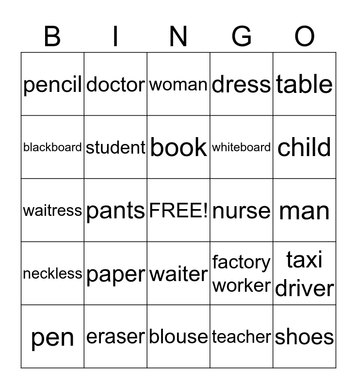 This bingo card has a free space and 24 words: paper, eraser, book, pen, table, pencil, blackboard, doctor, nurse, waiter, whiteboard, waitress, factory worker, taxi driver, student, teacher, man, woman, child, pants, shoes, neckless, dress and blouse.