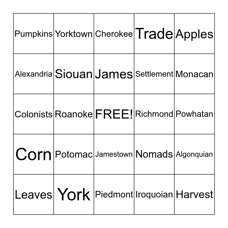 This bingo card has a free space and 24 words: Potomac, York, James, Leaves, Apples, Pumpkins, Alexandria, Yorktown, Richmond, Jamestown, Settlement, Colonists, Nomads, Algonquian, Siouan, Iroquoian, Powhatan, Cherokee, Monacan, Roanoke, Harvest, Corn, Trade and Piedmont.