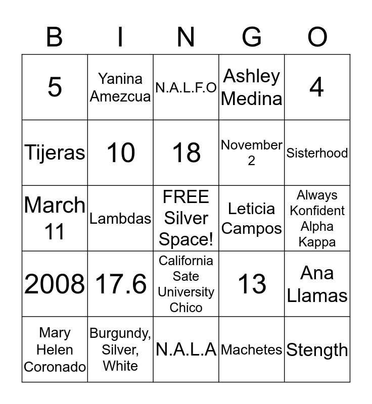 This bingo card has a free space and 24 words: 17.6, Burgundy, Silver, White, 18, Mary Helen Coronado, 4, 5, Tijeras, Yanina Amezcua, Leticia Campos, California Sate University Chico, November 2, March 11, 13, Ana Llamas, 10, Machetes, Always Konfident Alpha Kappa, N.A.L.F.O, Sisterhood, Lambdas, Stength, 2008, Ashley Medina and N.A.L.A.