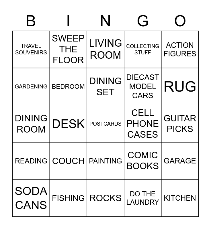 This bingo card has 54 words: PLAYING MUSIC, READING, PLAYING BOARD GAMES, PHOTOGRAPHY, PAINTING, MODEL BUILDING, COLLECTING STUFF, COOKING, GARDENING, TOYS, TRAVEL SOUVENIRS, VINTAGE GAMES, FISHING, SODA CANS, SPORTS MEMORABILIA, ROCKS, POSTCARDS, DIECAST MODEL CARS, DOLLS, GUITAR PICKS, COMIC BOOKS, COINS, CELL PHONE CASES, ACTION FIGURES, MAKE THE BED, SWEEP THE FLOOR, VACUUM, IRON CLOTHES, DUST, DO THE LAUNDRY, DO THE DISHES, COOK, CLEAN, LAUNDRY ROOM, LIVING ROOM, MASTER BEDROOM, DINING ROOM, GARAGE, KITCHEN, BEDROOM, BATHROOM, BACK YARD, BED, CHAIR, COUCH, CUPBOARDS, MICROWAVE OVEN, FRIDGE, DINING SET, DESK, RUG, STOVE, WARDROBE and WASHING MACHINE.