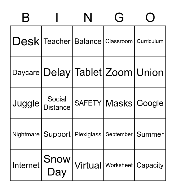 This bingo card has a free space and 24 words: Support, Snow Day, Tablet, Internet, Curriculum, Desk, Daycare, Teacher, Masks, Plexiglass, Zoom, Juggle, September, Summer, Delay, Worksheet, Google, Balance, Union, Social Distance, Capacity, Nightmare, Classroom and Virtual.