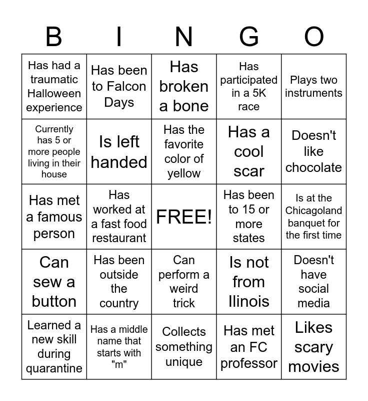 This bingo card has a free space and 24 words: Has been outside the country, Has a middle name that starts with "m", Has the favorite color of yellow, Learned a new skill during quarantine, Plays two instruments, Has had a traumatic Halloween experience, Currently has 5 or more people living in their house, Has been to Falcon Days, Has been to 15 or more states, Can perform a weird trick, Has a cool scar, Has met a famous person, Is not from Ilinois, Doesn't have social media, Is left handed, Has met an FC professor, Is at the Chicagoland banquet for the first time, Has broken a bone, Doesn't like chocolate, Has worked at a fast food restaurant, Likes scary movies, Can sew a button, Has participated in a 5K race and Collects something unique.