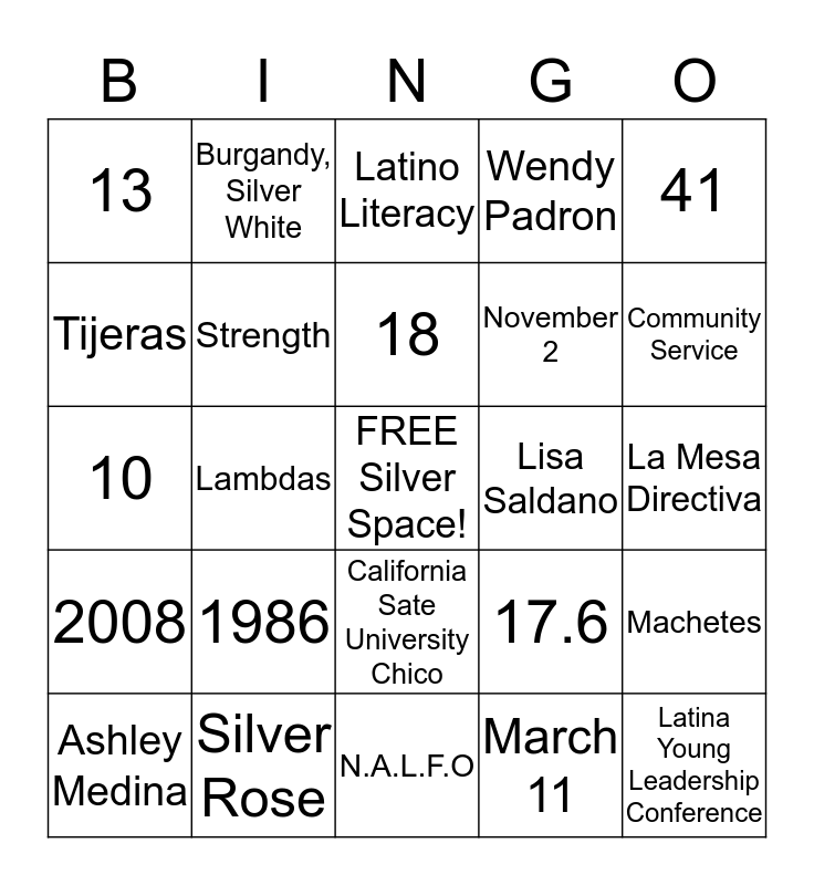 This bingo card has a free space and 24 words: 1986, Silver Rose, 18, Ashley Medina, 41, 13, Tijeras, Burgandy, Silver White, Lisa Saldano, California Sate University Chico, November 2, 10, 17.6, Machetes, Strength, March 11, La Mesa Directiva, Latino Literacy, Community Service, Lambdas, Latina Young Leadership Conference, 2008, Wendy Padron and N.A.L.F.O.