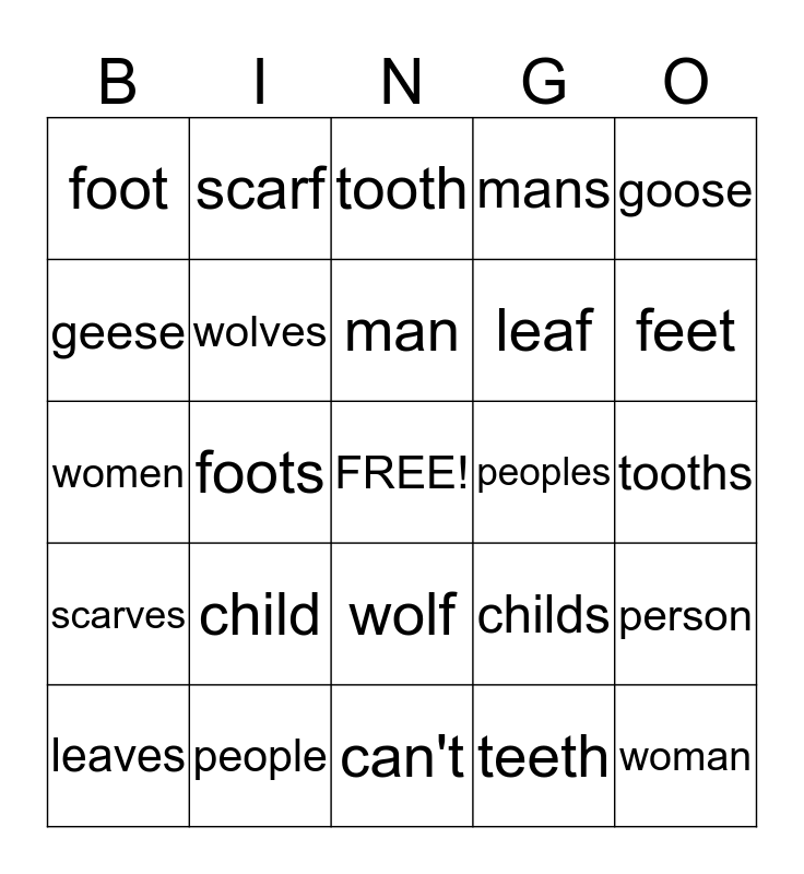 This bingo card has a free space and 24 words: child, people, man, leaves, goose, foot, geese, scarf, peoples, wolf, leaf, women, childs, person, wolves, teeth, tooths, tooth, feet, foots, woman, scarves, mans and can't.