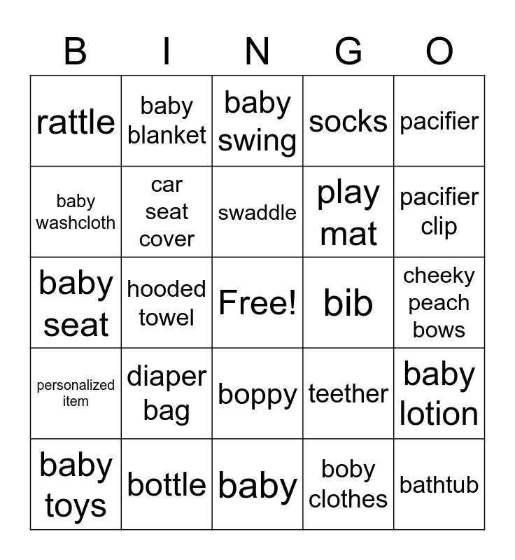 This bingo card has a free space and 24 words: diaper bag, bottle, swaddle, baby toys, pacifier, rattle, baby washcloth, baby blanket, bib, boppy, play mat, baby seat, teether, baby lotion, car seat cover, boby clothes, cheeky peach bows, baby swing, pacifier clip, hooded towel, bathtub, personalized item, socks and baby.