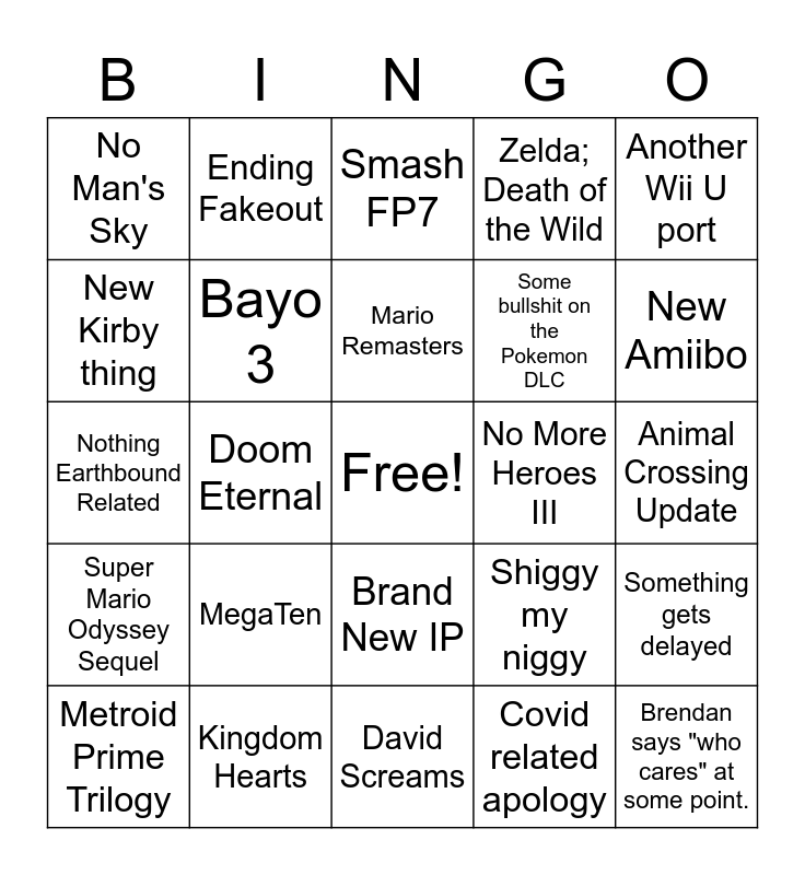 This bingo card has a free space and 24 words: MegaTen, Kingdom Hearts, Mario Remasters, Metroid Prime Trilogy, Another Wii U port, No Man's Sky, New Kirby thing, Ending Fakeout, No More Heroes III, Brand New IP, Some bullshit on the Pokemon DLC, Nothing Earthbound Related, Shiggy my niggy, Something gets delayed, Bayo 3, Covid related apology, Animal Crossing Update, Smash FP7, New Amiibo, Doom Eternal, Brendan says "who cares" at some point., Super Mario Odyssey Sequel, Zelda; Death of the Wild and David Screams.