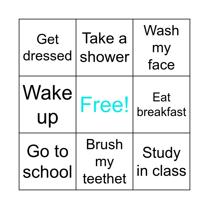 This bingo card has a free space and 8 words: Wake up, Take a shower, Eat breakfast, Go to school, Wash my face, Get dressed, Brush my teethet and Study in class.