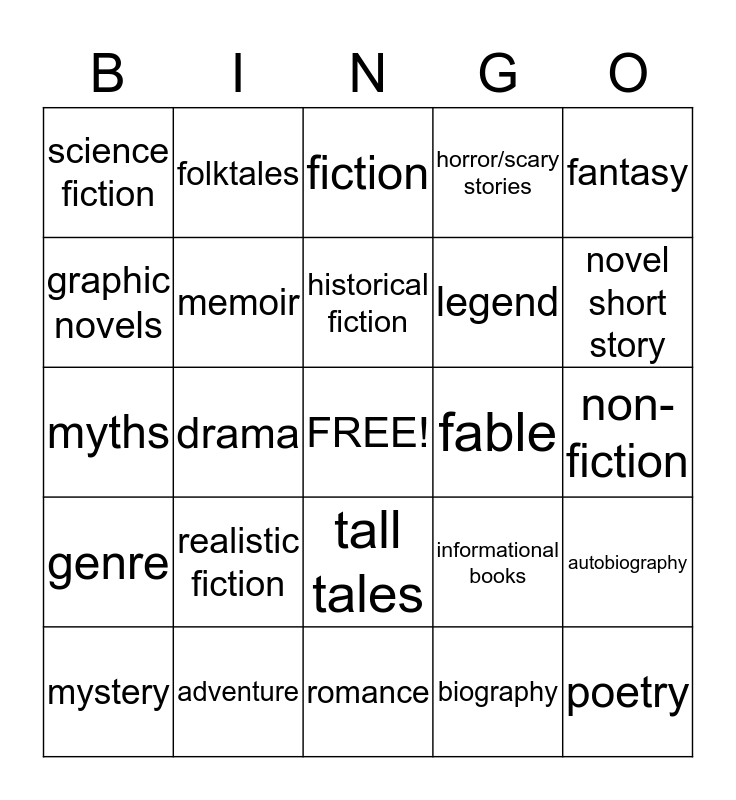 This bingo card has a free space and 24 words: realistic fiction, adventure, historical fiction, mystery, fantasy, science fiction, graphic novels, folktales, fable, tall tales, legend, myths, informational books, autobiography, memoir, biography, non-fiction, fiction, novel short story, drama, poetry, genre, horror/scary stories and romance.