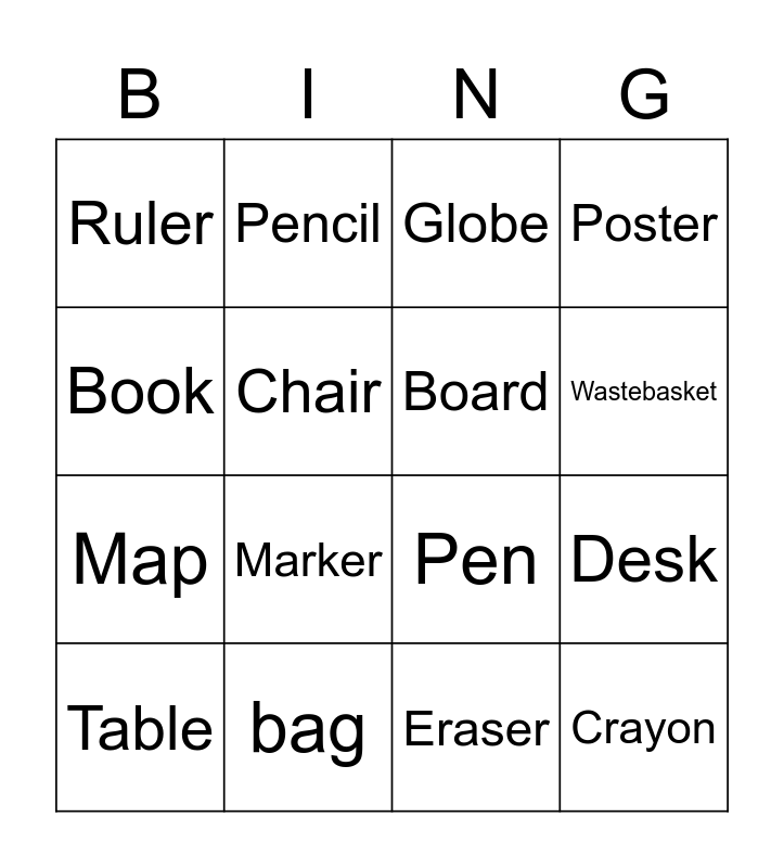 This bingo card has 16 words: bag, Desk, Globe, Ruler, Map, Pencil, Pen, Eraser, Book, Chair, Table, Poster, Marker, Wastebasket, Board and Crayon.