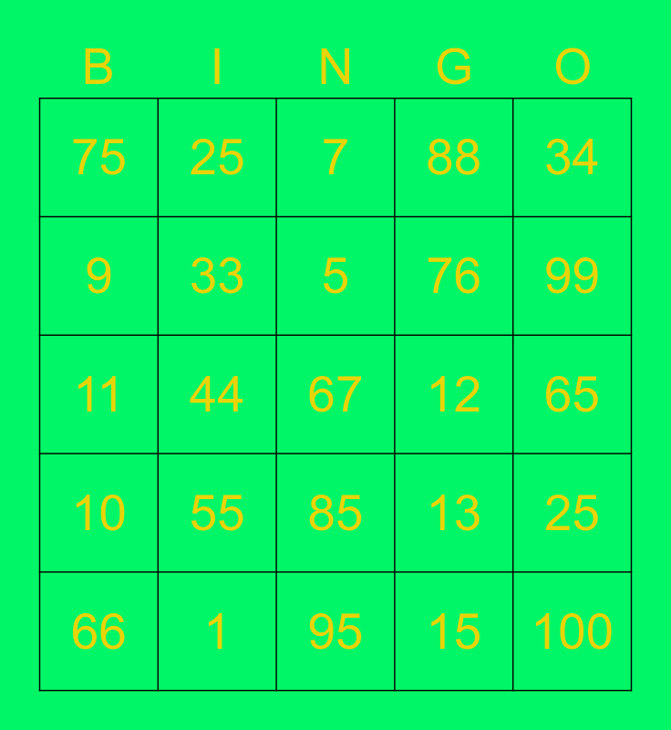 This bingo card has a free space and 24 words: 55, 1, 5, 66, 34, 75, 9, 25, 12, 85, 76, 11, 13, 25, 33, 15, 65, 7, 99, 44, 100, 10, 88 and 95.