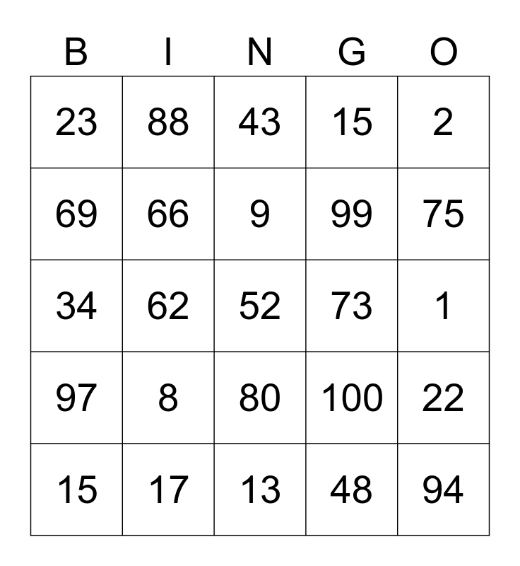 This bingo card has a free space and 24 words: 8, 17, 9, 15, 2, 23, 69, 88, 73, 80, 99, 34, 100, 22, 66, 48, 1, 43, 75, 62, 94, 97, 15 and 13.