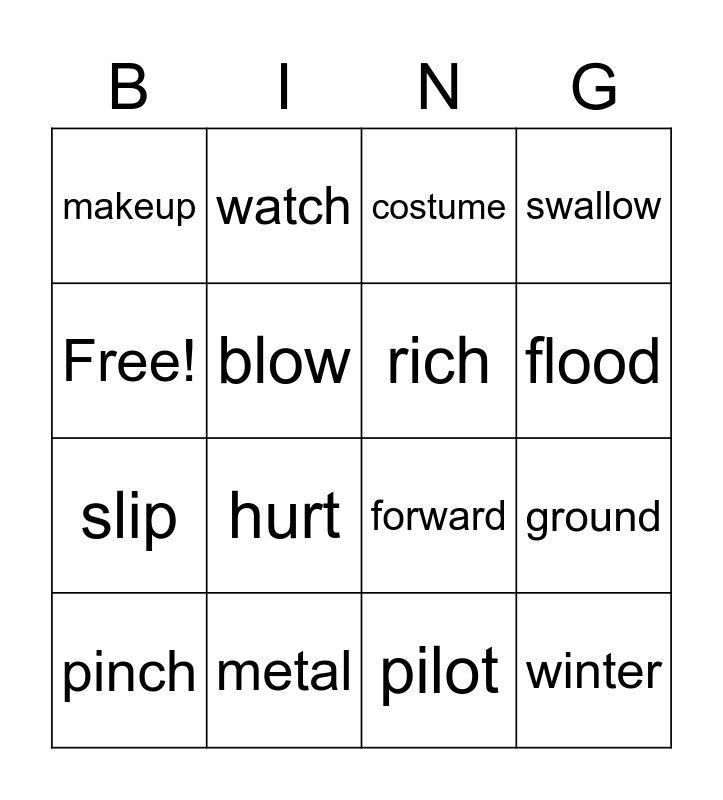 This bingo card has 16 words: metal, ground, costume, makeup, slip, watch, forward, pilot, Free!, blow, pinch, swallow, hurt, flood, rich and winter.
