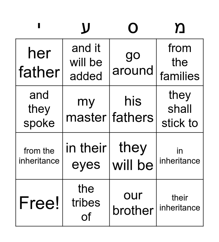 This bingo card has 29 words: Free!, and they came near, the heads of, to the family, from the families, and they spoke, my master, to give, in inheritance, in a lottery, the inheritance of, our brother, to his daughters, and they will be, the tribes of, as wives, their inheritance, from the inheritance, and it will be added, they will be, our inheritance, are speaking, in their eyes, go around, they shall stick to, her father, in order, his fathers and and they were.