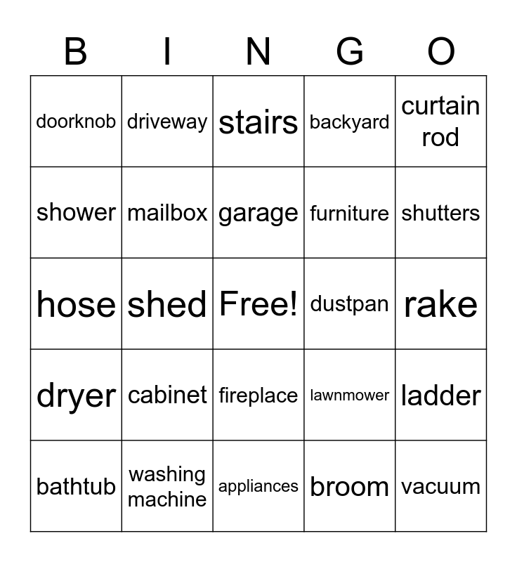 This bingo card has a free space and 25 words: cabinet, appliances, garage, bathtub, curtain rod, doorknob, shower, driveway, dustpan, fireplace, furniture, hose, lawnmower, ladder, mailbox, porch, rake, stairs, shutters, shed, vacuum, washing machine, dryer, backyard and broom.