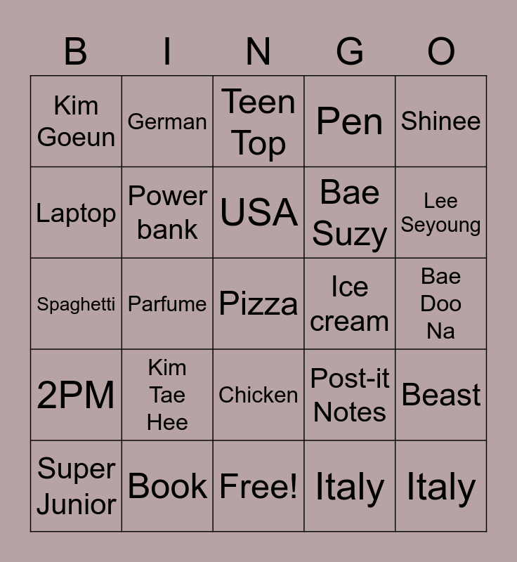 This bingo card has 25 words: 2PM, Book, Pizza, Italy, Shinee, Kim Goeun, German, Teen Top, Ice cream, Beast, Laptop, Power bank, Free!, Post-it Notes, Lee Seyoung, Super Junior, Parfume, USA, Bae Suzy, Bae Doo Na, Spaghetti, Kim Tae Hee, Chicken, Pen and Italy.