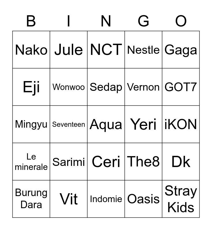 This bingo card has 25 words: Sarimi, Indomie, Sedap, Burung Dara, Gaga, Nako, Eji, Jule, Yeri, Ceri, Vernon, Mingyu, The8, Dk, Wonwoo, Stray Kids, iKON, NCT, GOT7, Seventeen, Aqua, Vit, Le minerale, Nestle and Oasis.
