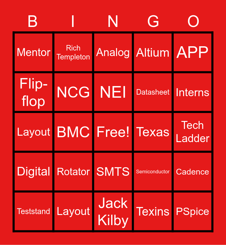 This bingo card has a free space and 27 words: Semiconductor, Wafer, Datasheet, Jack Kilby, Flip-flop, Analog, Rich Templeton, Digital, Texas, Cadence, Layout, Altium, Teststand, Layout, Interns, Schematic, NCG, NEI, Rotator, Mentor, Tech Ladder, Texins, BMC, PSpice, SMTS, APP and Happy hour.
