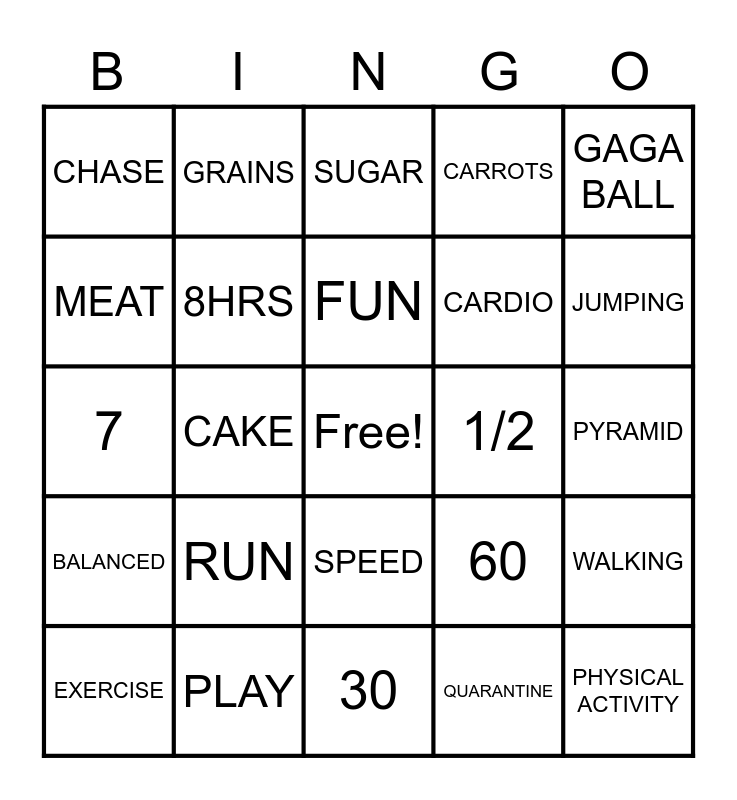 This bingo card has a free space and 24 words: RUN, PLAY, FUN, EXERCISE, GAGA BALL, CHASE, MEAT, GRAINS, 1/2, SPEED, CARDIO, 7, 60, WALKING, 8HRS, QUARANTINE, PYRAMID, SUGAR, JUMPING, CAKE, PHYSICAL ACTIVITY, BALANCED, CARROTS and 30.