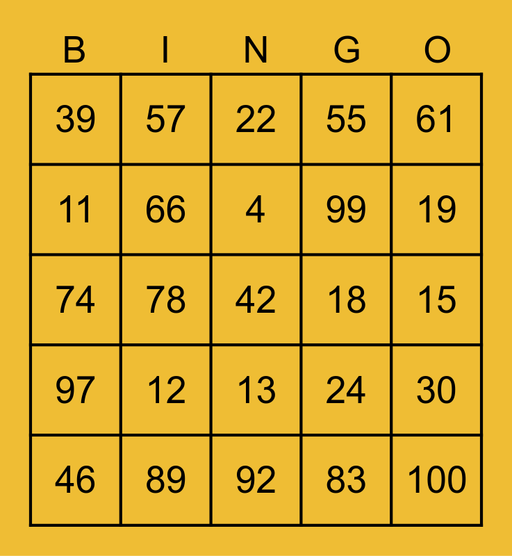 This bingo card has a free space and 24 words: 46, 12, 4, 83, 61, 39, 57, 22, 18, 15, 74, 66, 24, 30, 11, 89, 92, 55, 19, 97, 78, 13, 99 and 100.