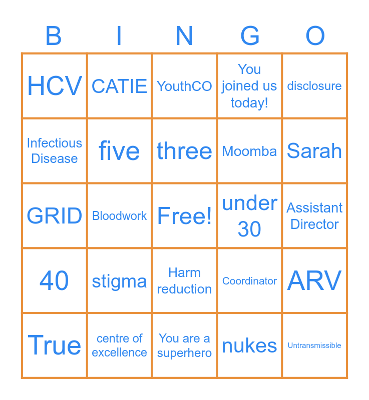 This bingo card has a free space and 26 words: 40, centre of excellence, three, nukes, disclosure, HCV, five, YouthCO, Moomba, Untransmissible, Infectious Disease, Bloodwork, 11, Coordinator, Assistant Director, Julio Montero, CATIE, Harm reduction, You joined us today!, ARV, GRID, stigma, You are a superhero, under 30, Sarah and True.