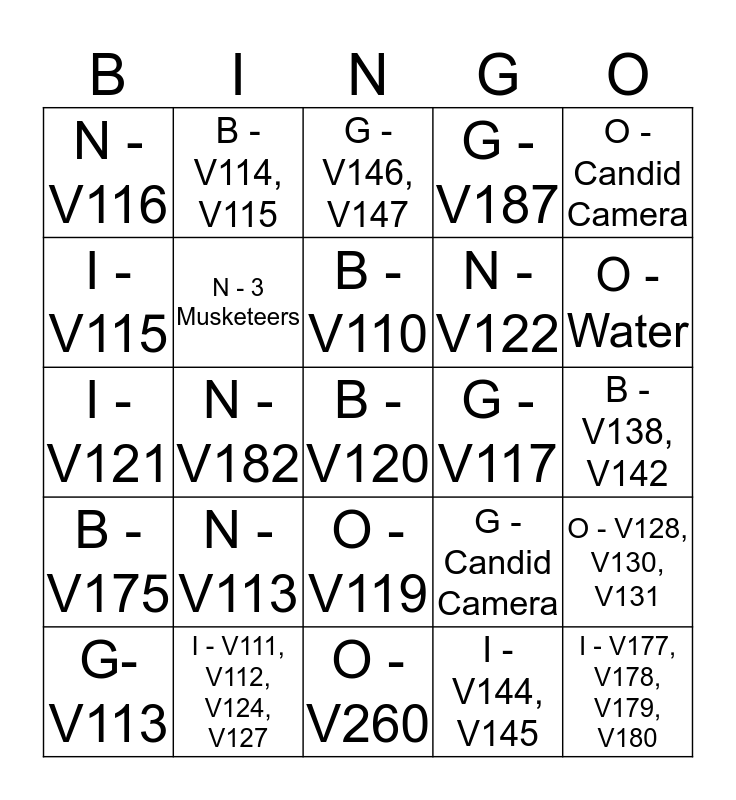 This bingo card has a free space and 24 words: N - V113, I - V111, V112, V124, V127, B - V110, G- V113, O - Candid Camera, N - V116, I - V115, B - V114, V115, G - V117, O - V119, N - V122, I - V121, G - Candid Camera, O - V128, V130, V131, N - 3 Musketeers, I - V144, V145, B - V138, V142, G - V146, V147, O - Water, N - V182, I - V177, V178, V179, V180, B - V175, G - V187 and O - V260.