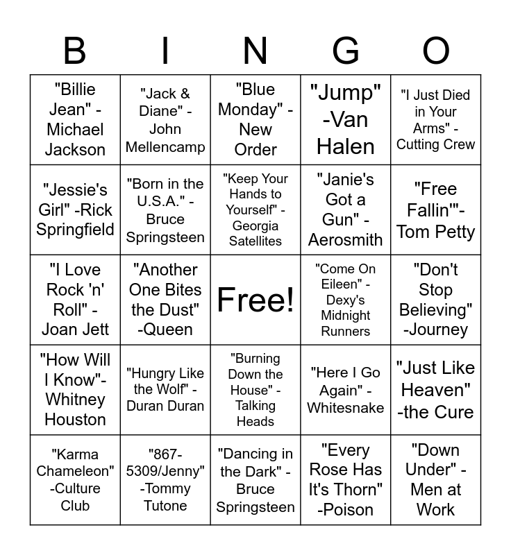 This bingo card has a free space and 30 words: "867-5309/Jenny" -Tommy Tutone, "All Night Long" -Lionel Richie, "Another One Bites the Dust" -Queen, "Beat It" -Michael Jackson, "Billie Jean" -Michael Jackson, "Blue Monday" -New Order, "Born in the U.S.A." -Bruce Springsteen, "Burning Down the House" -Talking Heads, "Come On Eileen" -Dexy's Midnight Runners, "Dancing in the Dark" -Bruce Springsteen, "Don't Stop Believing" -Journey, "Down Under" -Men at Work, "Every Rose Has It's Thorn" -Poison, "Everybody Wants to Rule the World" -Tears for Fears, "Free Fallin'"-Tom Petty, "Girls Just Want to Have Fun" -Cyndi Lauper, "Here I Go Again" -Whitesnake, "How Will I Know"-Whitney Houston, "Hungry Like the Wolf" -Duran Duran, "I Just Died in Your Arms" - Cutting Crew, "I Love Rock 'n' Roll" -Joan Jett, "I Wanna Dance with Somebody" -Whitney Houston, "Jack & Diane" -John Mellencamp, "Janie's Got a Gun" -Aerosmith, "Jessie's Girl" -Rick Springfield, "Jump" -Van Halen, "Just Like Heaven" -the Cure, "Karma Chameleon" -Culture Club, "Keep Your Hands to Yourself" - Georgia Satellites and "Kiss" -Prince.