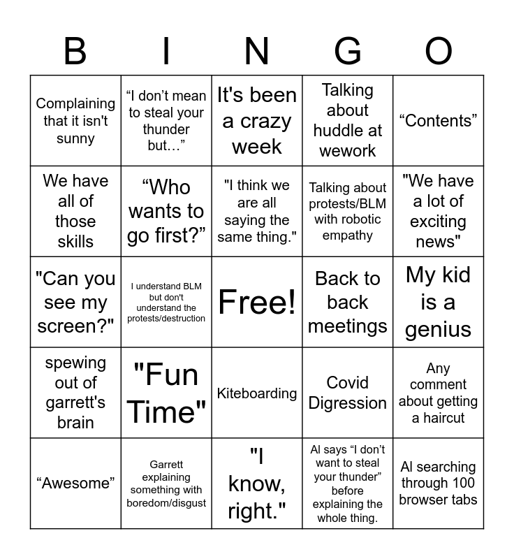 This bingo card has a free space and 34 words: Chris has nothing better to do, Al says “I don’t want to steal your thunder” before explaining the whole thing., guilt for finishing early, going over time, spewing out of garrett's brain, “Who wants to go first?”, “Contents”, “Awesome”, “I don’t mean to steal your thunder but…”, “Can you explain this for us non-technical people?”, "I think we are all saying the same thing.", It's been a crazy week, We have a lot to cover, Let's get started, Back to back meetings, "We have a lot of exciting news", Garrett explaining something with boredom/disgust, "Can you see my screen?", "Fun Time", Covid Digression, Kiteboarding, Complaining that it's too hot, Complaining that it isn't sunny, My kid is a genius, "I know, right.", Al searching through 100 browser tabs, Talking about huddle at wework, Talking about getting together for a beer someday, Talking about protests/BLM with robotic empathy, We have all of those skills, This is easy for us / in our wheelhouse, I understand BLM but don't understand the protests/destruction, Any comment about getting a haircut and "I look like George Clooney".