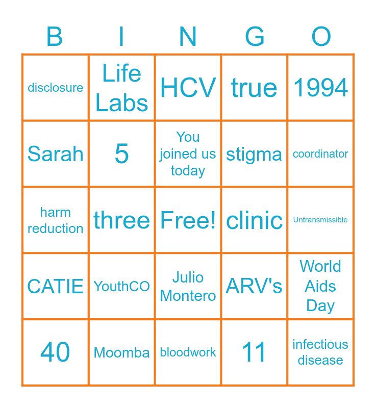 This bingo card has a free space and 29 words: 40, Centre of Excellence, three, nukes, disclosure, HCV, 5, YouthCO, clinic, Moomba, Untransmissible, infectious disease, bloodwork, 11, coordinator, Assistant Director, Julio Montero, CATIE, 1994, harm reduction, ARV's, GRID, stigma, Sarah, true, Life Labs, World Aids Day, You joined us today and You are a superhero.