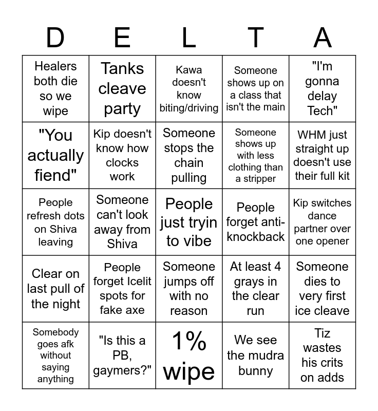 This bingo card has a free space and 30 words: "Is this a PB, gaymers?", "WHY DID YOU MOVE", Someone can't look away from Shiva, Someone takes a damage down, Healers both die so we wipe, Kawa doesn't know biting/driving, Kip doesn't know how clocks work, Someone jumps off with no reason, People forget anti-knockback, 1% wipe, Kip switches dance partner over one opener, Tiz wastes his crits on adds, We see the mudra bunny, The AST doesn't use all their cards, WHM just straight up doesn't use their full kit, LR Wipe, At least 4 grays in the clear run, Clear on last pull of the night, People forget Icelit spots for fake axe, "I'm gonna delay Tech", People refresh dots on Shiva leaving, Someone drops aoe where spot is suppose to be safe, Tanks cleave party, Someone shows up with less clothing than a stripper, "You actually fiend", Someone shows up on a class that isn't the main, Someone dies to very first ice cleave, Somebody goes afk without saying anything, Someone stops the chain pulling and People say they need a break after 1 hour.