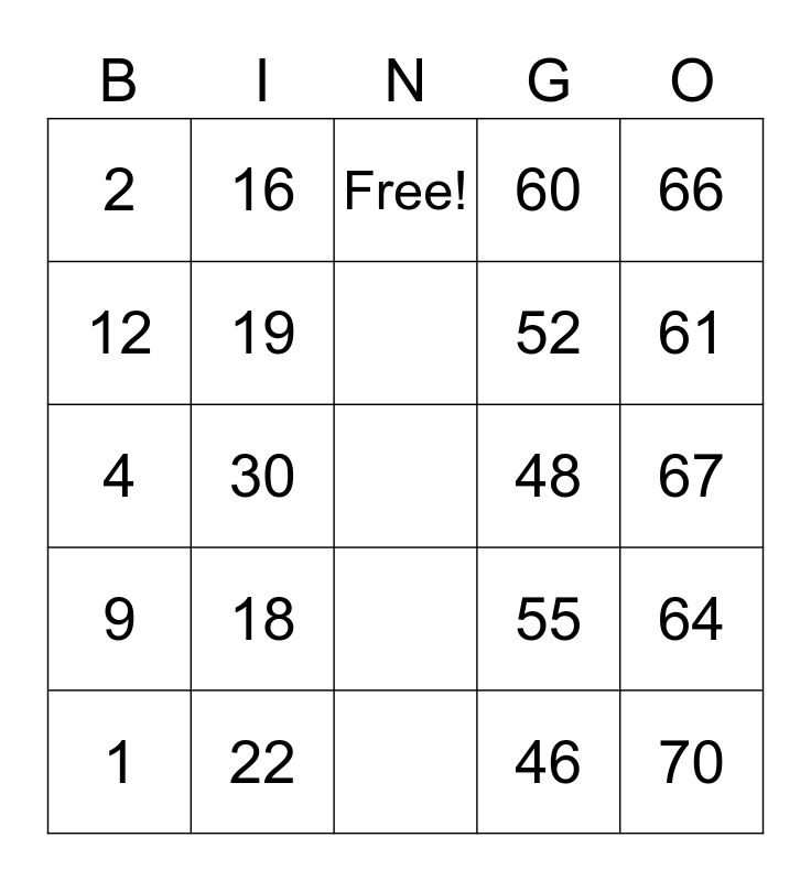 This bingo card has 25 words: 1, 75, 4, 22, 52, 66, 12, 16, Free!, 55, 67, 9, 18, 46, 61, 5, 70, 2, 19, 48, 64, 13, 30, 60 and 65.