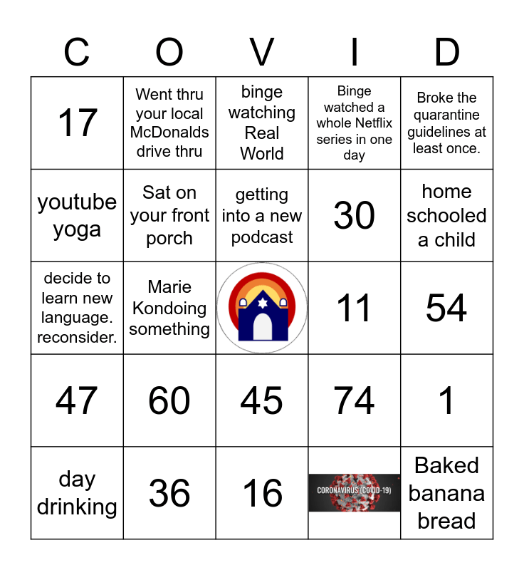 This bingo card has 3 images, a free space and 71 words: A day in pajamas, certain you've got the virus, binge watching Real World, loud kid in the back of a zoom, brand new hobby, art project, cleaning your bathroom, Rode your bike, day drinking, 1000 piece puzzle, Cut your own hair, Joined a virtual conference, getting into a new podcast, youtube yoga, read a book, Marie Kondoing something, hands cracking from washing, home schooled a child, Dyed your own hair, decide to learn new language. reconsider., Sat on your front porch, Went thru your local McDonalds drive thru, Binge watched a whole Netflix series in one day, midday luxurious nap, Baked banana bread, Remodeled a room in your house, Baked a loaf of bread, Ran out of TP, Braved Costco, Went to the mailbox in your PJs, Broke the quarantine guidelines at least once., Wore regular clothes more than once in a week, Watched Tiger King, Got a puppy, 46, 61, 15, 16, 36, 50, 63, 10, 17, 44, 60, 65, 8, 23, 37, 54, 67, 9, 24, 45, 52, 69, 1, 30, 39, 47, 75, 11, 20, 42, 51, 74, 13, 28, 33, 58 and 70.