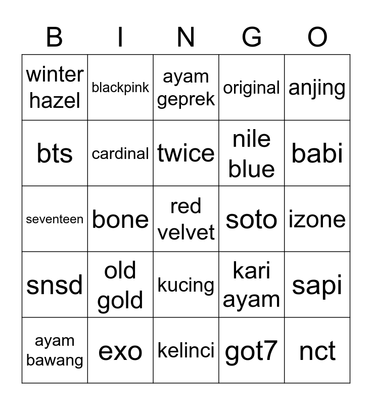 This bingo card has a free space and 24 words: old gold, exo, twice, ayam bawang, anjing, winter hazel, bts, blackpink, soto, kucing, nile blue, seventeen, kari ayam, sapi, cardinal, got7, izone, ayam geprek, babi, bone, nct, snsd, original and kelinci.