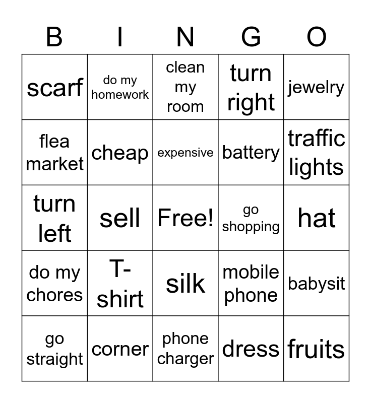 This bingo card has a free space and 27 words: mobile phone, ringing phone, battery, phone charger, flea market, clean my room, do my homework, do my chores, go shopping, babysit, turn left, turn right, go straight, corner, traffic lights, stop sign, cheap, expensive, T-shirt, scarf, hat, dress, sell, fruits, silk, jewelry and seafood.