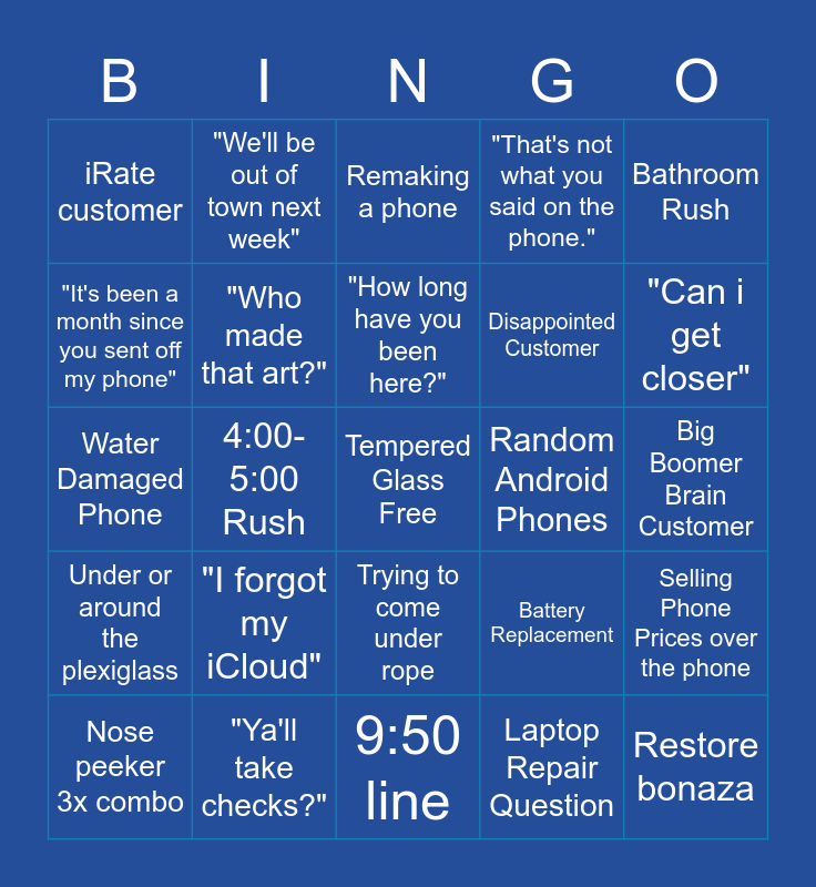 This bingo card has a free space and 49 words: Warranty combo, Restore bonaza, Frustrated iPad Dad, 9:50 line, "I forgot my iCloud", Pays in $100 only, "We'll be out of town next week", "Y'all open on Sundays?", "It's been a month since you sent off my phone", random visitors, "Who made that art?", "That's not what you said on the phone.", Selling Phone Prices over the phone, Battery Replacement, Customer brings in a destroyed phone, Frame Swap, "How long have you been here?", Random Android Phones, "I thought the tempered glass covered that?", Bathroom Rush, 4:00-5:00 Rush, Laptop Repair Question, iRate customer, Disappointed Customer, Taking Mask off to hear, "Can i get closer", Nose peeker 3x combo, 5x Under chin combo, Trying to come under rope, Under or around the plexiglass, Putting ear between plexiglass, hand through the plexiglass, "do i need a mask?", Last 30 minute customer, "Ya'll take checks?", "Do i need an appointment?", Dirty Phone, (over 2) Back glass bonaza, Big Boomer Brain Customer, 3x Walk in combo, Daily Smartphone emergency call, Sticky Liquid Phone, Brandon 2x combo, Conspiracy Boomer Brain, Water Damaged Phone, Remaking a phone, Repair Spiral, "I was told this time" and "Hello?" 3x combo.