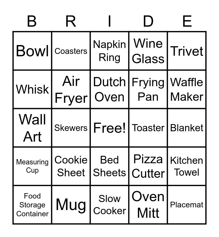 This bingo card has a free space and 44 words: Lingerie, Placemat, Salad Spinner, Food Storage Container, Trash Can, Oven Mitt, Napkin Ring, Water Filter, Trivet, Mug, Wine Glass, Toaster, Bed Sheets, Cookie Sheet, Flatware, Slow Cooker, Spatula, Wall Art, Gift Card, Waffle Maker, Coasters, Ladle, Can Opener, Bowl, Baking Dish, Blanket, Water Glass, Cutting Board, Pizza Cutter, Measuring Cup, Pillow, Kitchen Towel, Serving Platter, Basket, Skewers, Colander, Vase, Bath Towel, Dutch Oven, Whisk, Frying Pan, Muffin Tin, Air Fryer and House Plant.