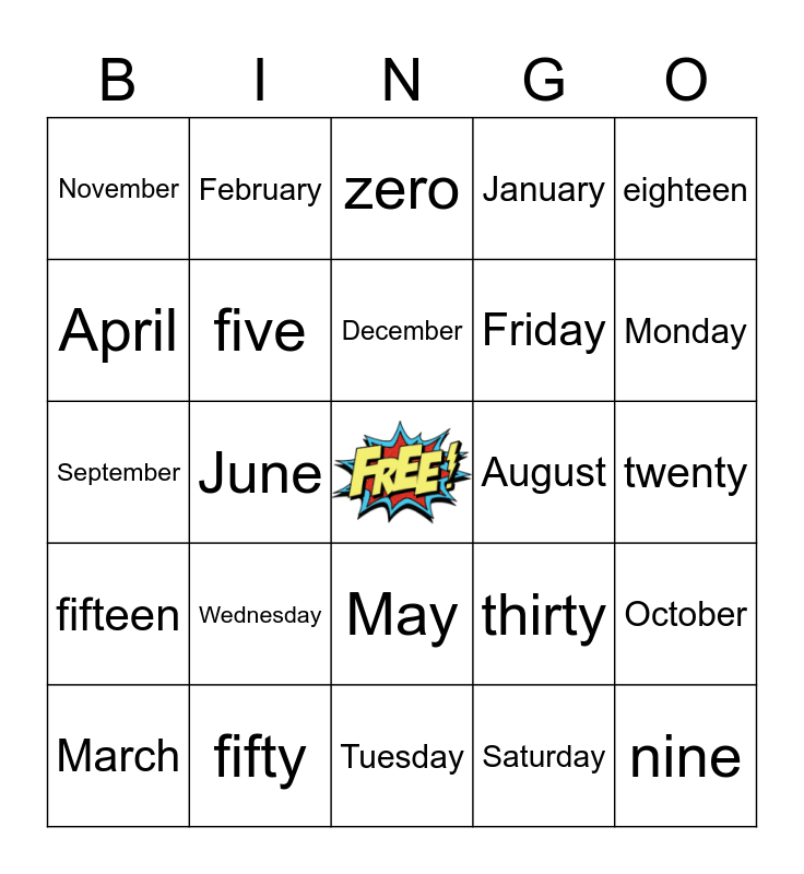 This bingo card has a free space and 29 words: March, eleven, June, fourteen, November, zero, five, Wednesday, August, fifty, twenty, nine, Tuesday, Saturday, Monday, thirteen, May, fifteen, eighteen, September, thirty, July, Friday, April, January, February, October, December and Thursday.