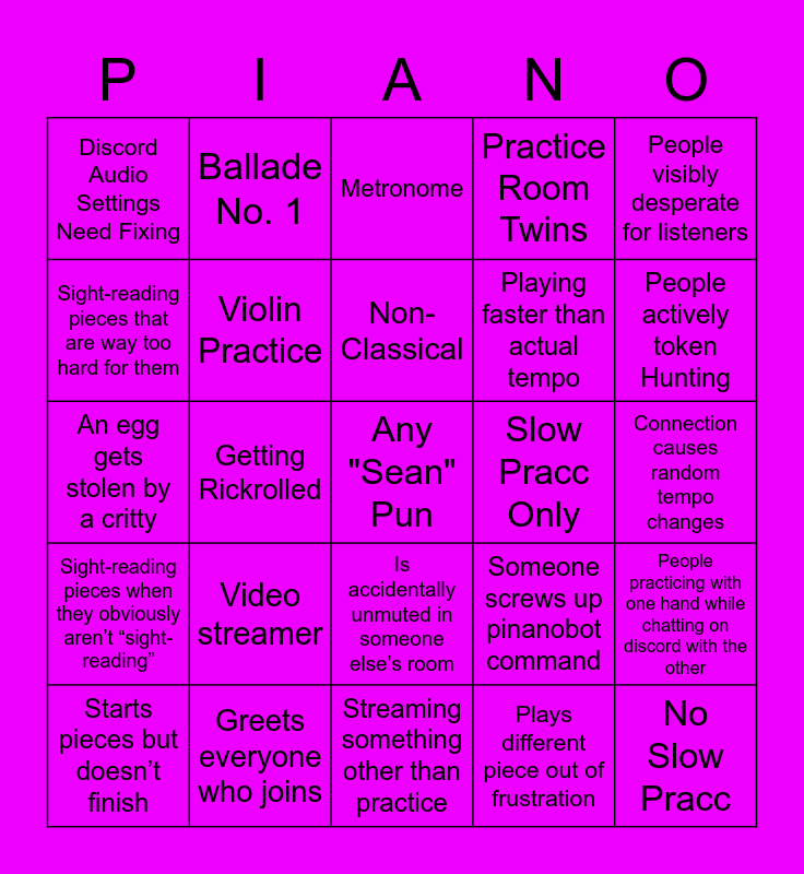 This bingo card has a free space and 24 words: Video streamer, Greets everyone who joins, Non-Classical, Starts pieces but doesn’t finish, People visibly desperate for listeners, Discord Audio Settings Need Fixing, Sight-reading pieces that are way too hard for them, Ballade No. 1, Slow Pracc Only, Is accidentally unmuted in someone else’s room, Playing faster than actual tempo, An egg gets stolen by a critty, Someone screws up pinanobot command, People practicing with one hand while chatting on discord with the other, Violin Practice, Plays different piece out of frustration, Connection causes random tempo changes, Metronome, People actively token Hunting, Getting Rickrolled, No Slow Pracc, Sight-reading pieces when they obviously aren’t “sight-reading”, Practice Room Twins and Streaming something other than practice.