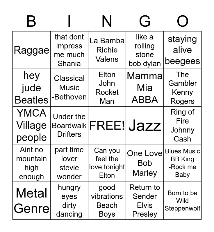 This bingo card has a free space and 24 words: part time lover stevie wonder, hungry eyes dirty dancing, Elton John Rocket Man, Metal Genre, staying alive beegees, Raggae, hey jude Beatles, that dont impress me much Shania, Jazz, Can you feel the love tonight Elton, Mamma Mia ABBA, YMCA Village people, One Love Bob Marley, Blues Music BB King -Rock me Baby, Classical Music -Bethoven, Return to Sender Elvis Presley, Ring of Fire Johnny Cash, La Bamba Richie Valens, The Gambler Kenny Rogers, Under the Boardwalk Drifters, Born to be Wild Steppenwolf, Aint no mountain high enough, like a rolling stone bob dylan and good vibrations Beach Boys.