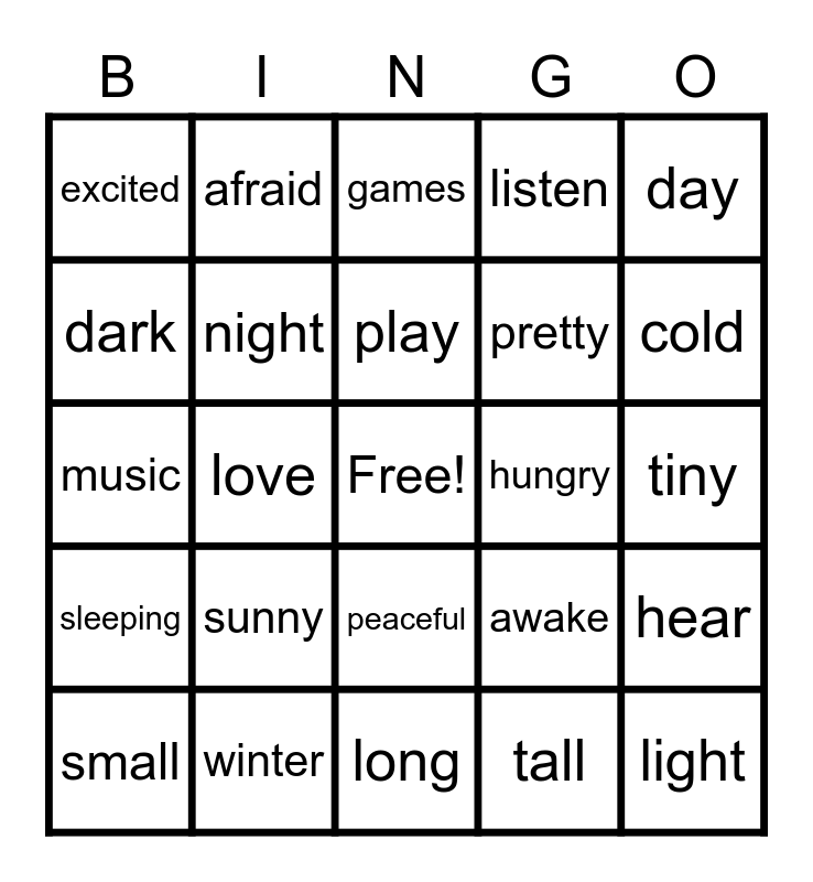 This bingo card has a free space and 24 words: sunny, winter, play, small, day, excited, dark, afraid, hungry, peaceful, pretty, music, awake, hear, night, tall, tiny, games, cold, love, light, sleeping, listen and long.