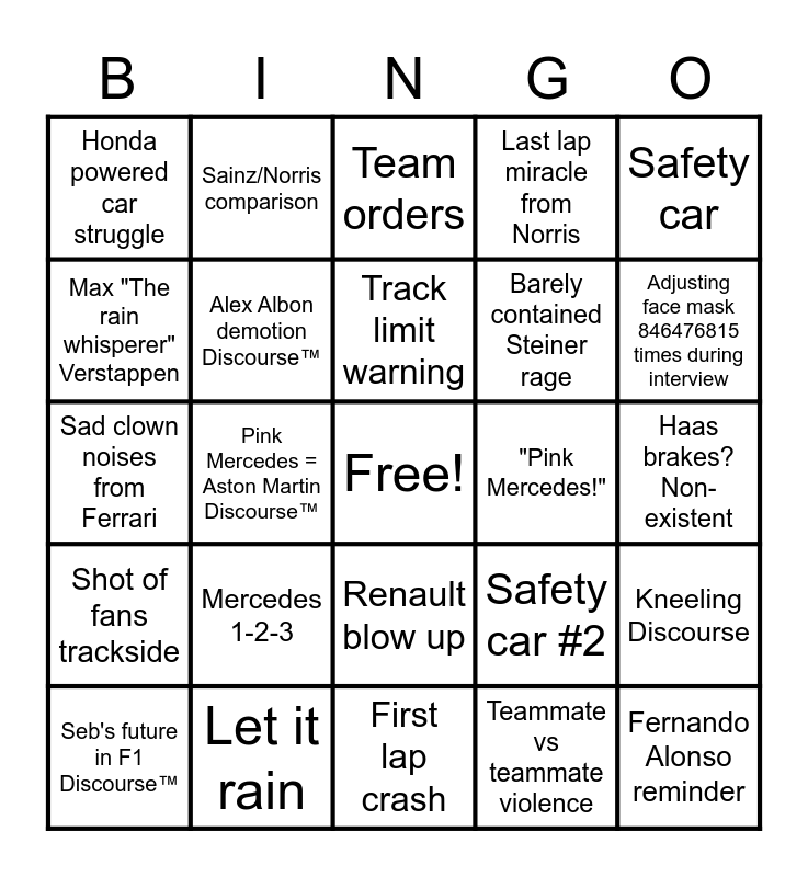 This bingo card has a free space and 24 words: Mercedes 1-2-3, Let it rain, Track limit warning, Seb's future in F1 Discourse™, Safety car, Honda powered car struggle, Max "The rain whisperer" Verstappen, Sainz/Norris comparison, "Pink Mercedes!", Renault blow up, Barely contained Steiner rage, Sad clown noises from Ferrari, Safety car #2, Kneeling Discourse, Alex Albon demotion Discourse™, Teammate vs teammate violence, Haas brakes? Non-existent, Team orders, Adjusting face mask 846476815 times during interview, Pink Mercedes = Aston Martin Discourse™, Fernando Alonso reminder, Shot of fans trackside, Last lap miracle from Norris and First lap crash.