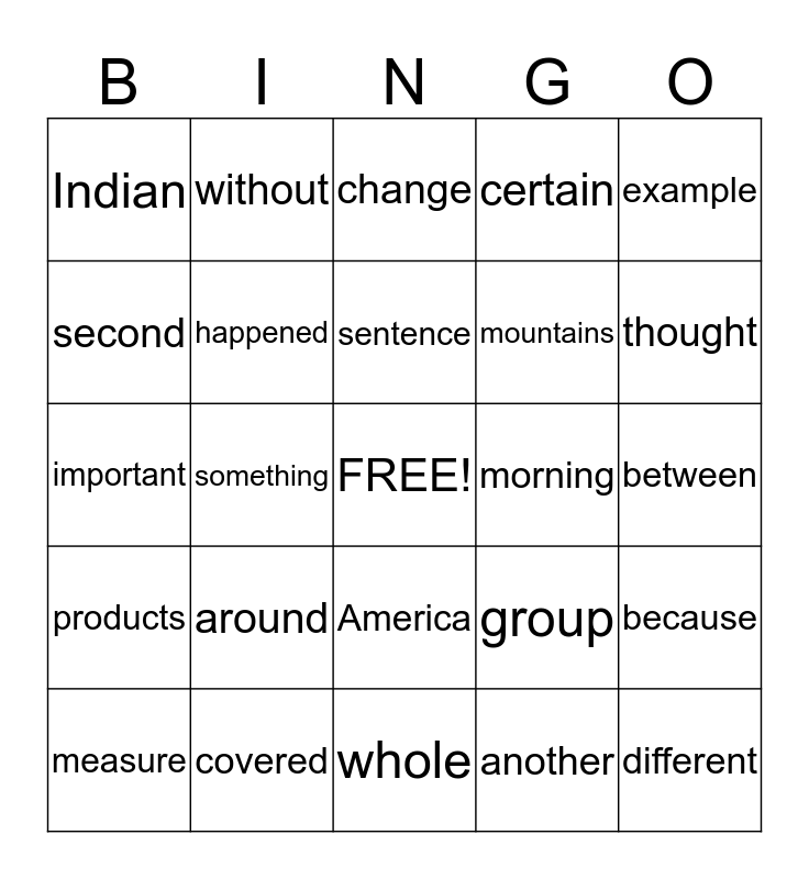 This bingo card has a free space and 42 words: sound, sentence, through, around, another, because, different, picture, change, America, between, thought, something, example, together, group, friendship, important, children, without, second, enough, watch, Indian, almost, sometimes, mountains, young, questions, become, however, products, happened, whole, hundred, measure, covered, morning, numeral, pattern, certain and English.
