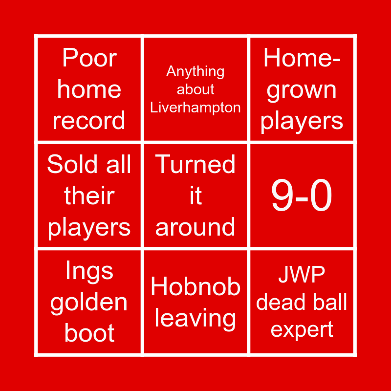 This bingo card has a free space and 8 words: 9-0, Home-grown players, Anything about Liverhampton, Ings golden boot, Poor home record, JWP dead ball expert, Sold all their players and Hobnob leaving.