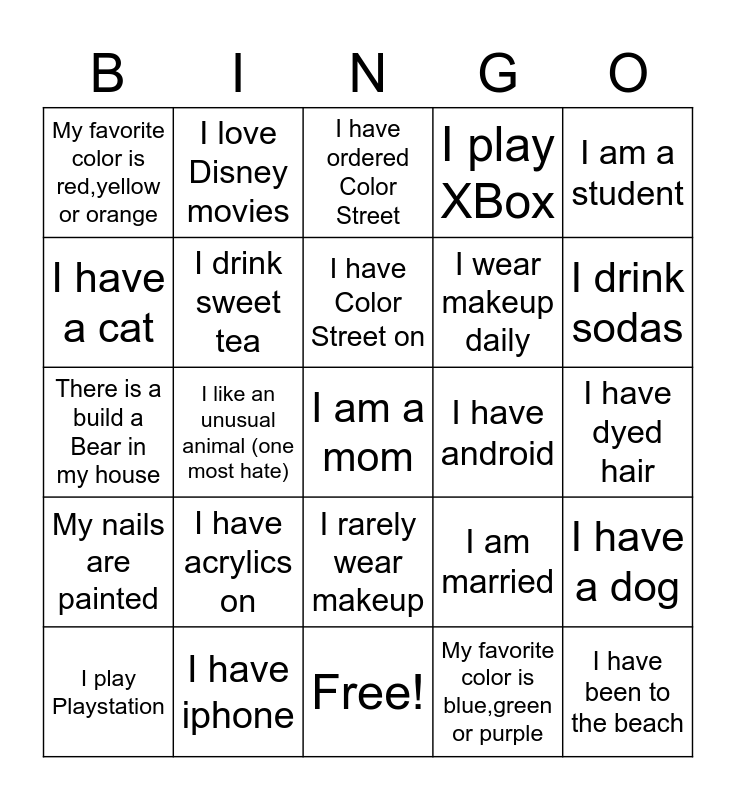 This bingo card has 25 words: My nails are painted, I have iphone, I am a mom, My favorite color is blue,green or purple, I am a student, My favorite color is red,yellow or orange, I love Disney movies, I have ordered Color Street, I have android, I have a dog, I have a cat, I drink sweet tea, Free!, I am married, I drink sodas, I play Playstation, I like an unusual animal (one most hate), I have Color Street on, I wear makeup daily, I have dyed hair, There is a build a Bear in my house, I have acrylics on, I rarely wear makeup, I play XBox and I have been to the beach.