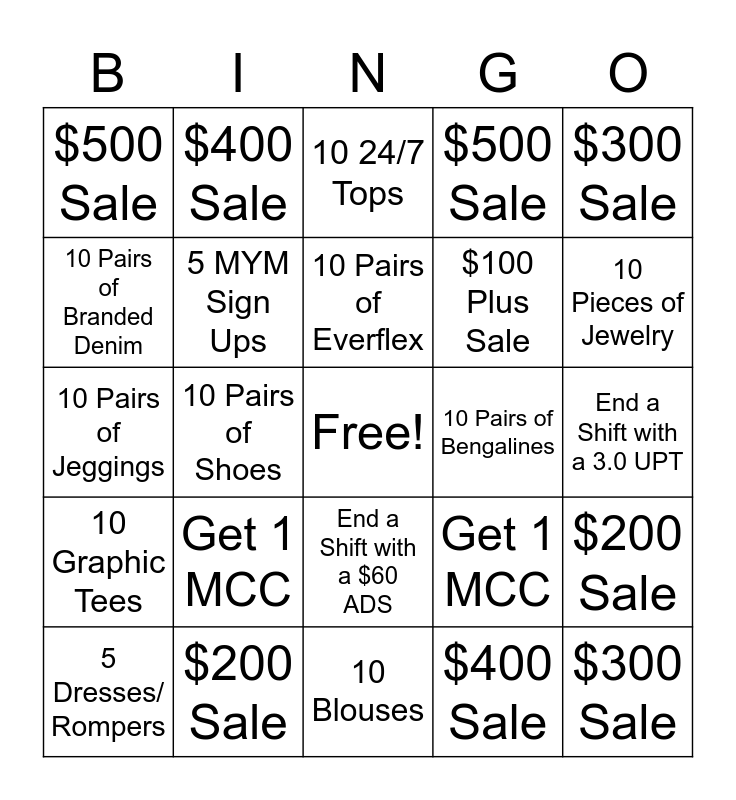 This bingo card has a free space and 24 words: Get 1 MCC, $200 Sale, 10 Pairs of Everflex, 5 Dresses/ Rompers, $300 Sale, $500 Sale, 10 Pairs of Branded Denim, $400 Sale, 10 Pairs of Bengalines, End a Shift with a $60 ADS, $100 Plus Sale, 10 Pairs of Jeggings, Get 1 MCC, $200 Sale, 5 MYM Sign Ups, $400 Sale, End a Shift with a 3.0 UPT, 10 24/7 Tops, 10 Pieces of Jewelry, 10 Pairs of Shoes, $300 Sale, 10 Graphic Tees, $500 Sale and 10 Blouses.
