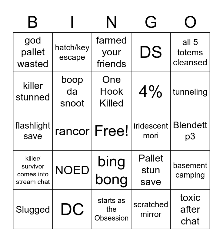 This bingo card has a free space and 24 words: NOED, DC, One Hook Killed, Slugged, all 5 totems cleansed, god pallet wasted, killer stunned, hatch/key escape, iridescent mori, bing bong, 4%, flashlight save, Pallet stun save, basement camping, boop da snoot, scratched mirror, Blendett p3, farmed your friends, tunneling, rancor, toxic after chat, killer/ survivor comes into stream chat, DS and starts as the Obsession.