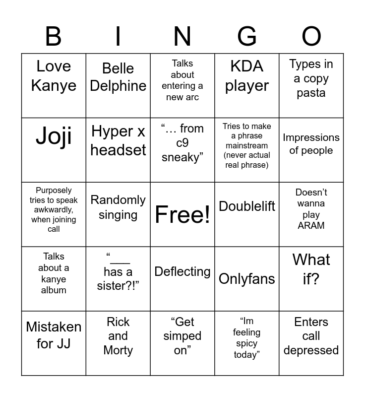 This bingo card has a free space and 24 words: “___ has a sister?!”, Rick and Morty, “… from c9 sneaky”, Mistaken for JJ, Types in a copy pasta, Love Kanye, Joji, Belle Delphine, Doublelift, Deflecting, Tries to make a phrase mainstream (never actual real phrase), Purposely tries to speak awkwardly, when joining call, Onlyfans, What if?, Hyper x headset, “Im feeling spicy today”, Doesn’t wanna play ARAM, Talks about entering a new arc, Impressions of people, Randomly singing, Enters call depressed, Talks about a kanye album, KDA player and “Get simped on”.