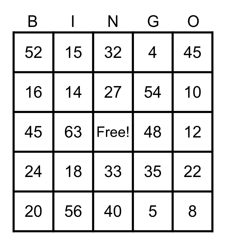 This bingo card has a free space and 38 words: 9, 2, 6, 14, 22, 18, 27, 36, 45, 54, 63, 4, 8, 12, 16, 24, 28, 32, 44, 48, 52, 56, 10, 20, 30, 40, 50, 35, 55, 3, 21, 33, 5, 15, 25, 35, 45 and 55.