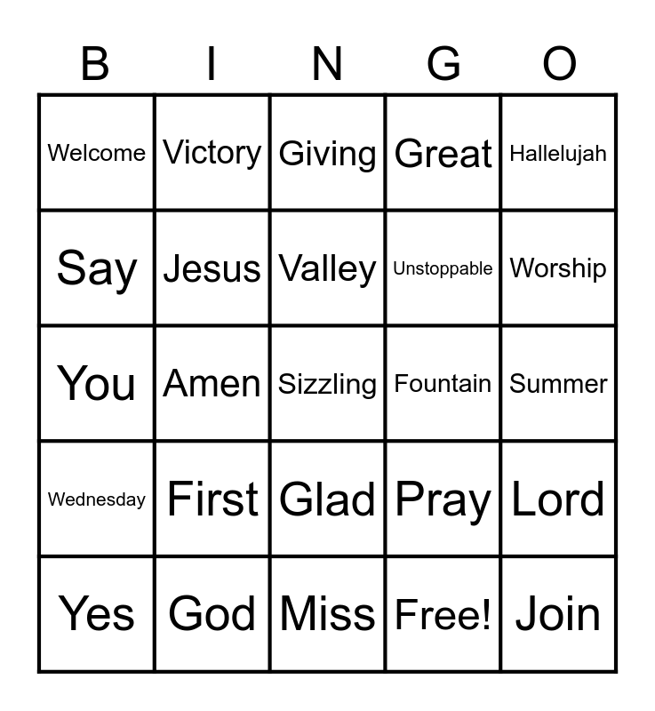 This bingo card has 30 words: God, Love, Amen, Here, Welcome, Giving, Jesus, Glad, Fountain, Miss, Summer, Sizzling, Free!, Join, Worship, Praise, Pray, Wednesday, First, Hallelujah, You, Peace, Victory, Unstoppable, Say, Great, Lord, Yes, Valley and Heaven.