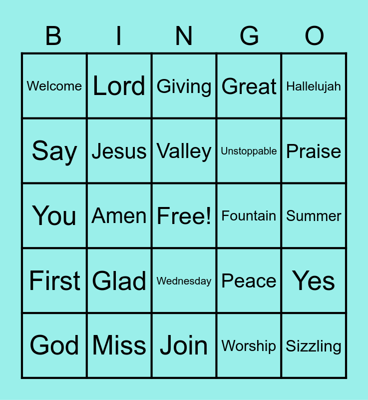 This bingo card has a free space and 29 words: God, Love, Amen, Here, Welcome, Giving, Jesus, Glad, Fountain, Miss, Summer, Sizzling, Join, Worship, Praise, Pray, Wednesday, First, Hallelujah, You, Peace, Victory, Unstoppable, Say, Great, Lord, Yes, Valley and Heaven.